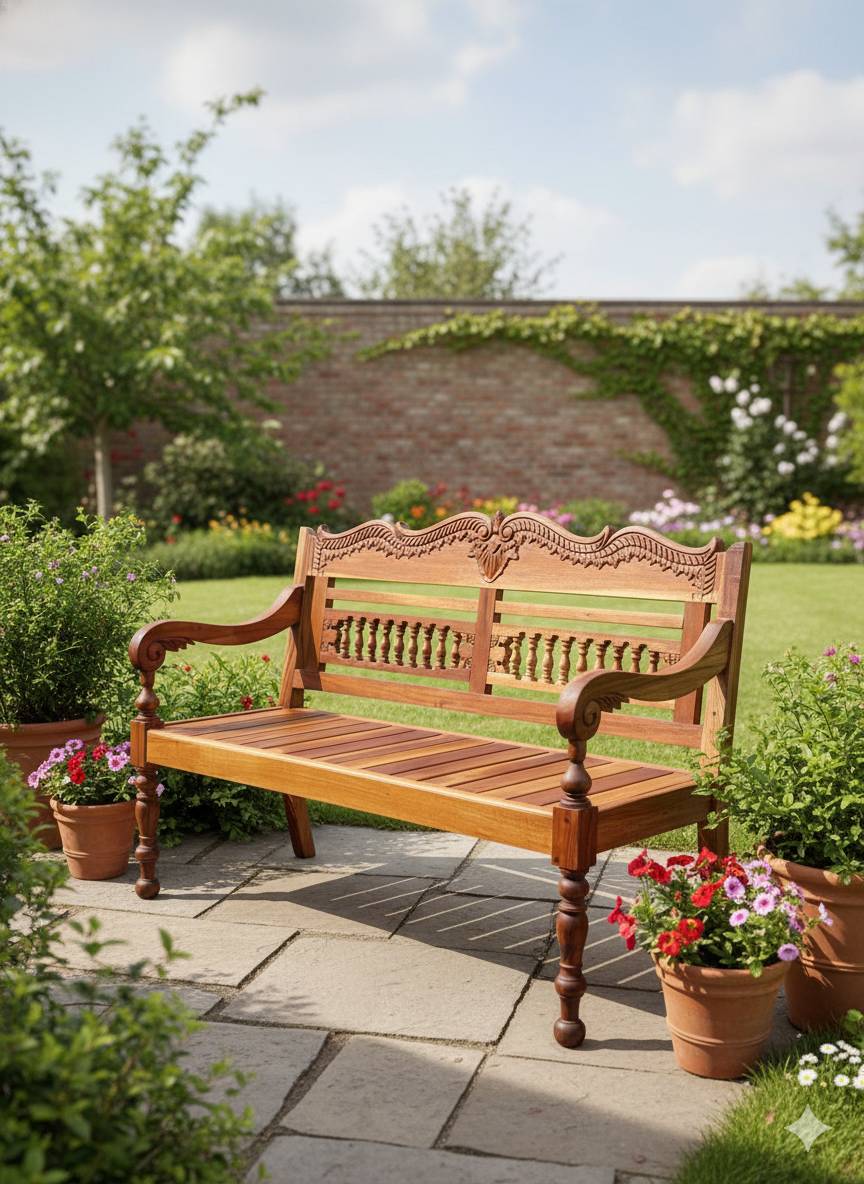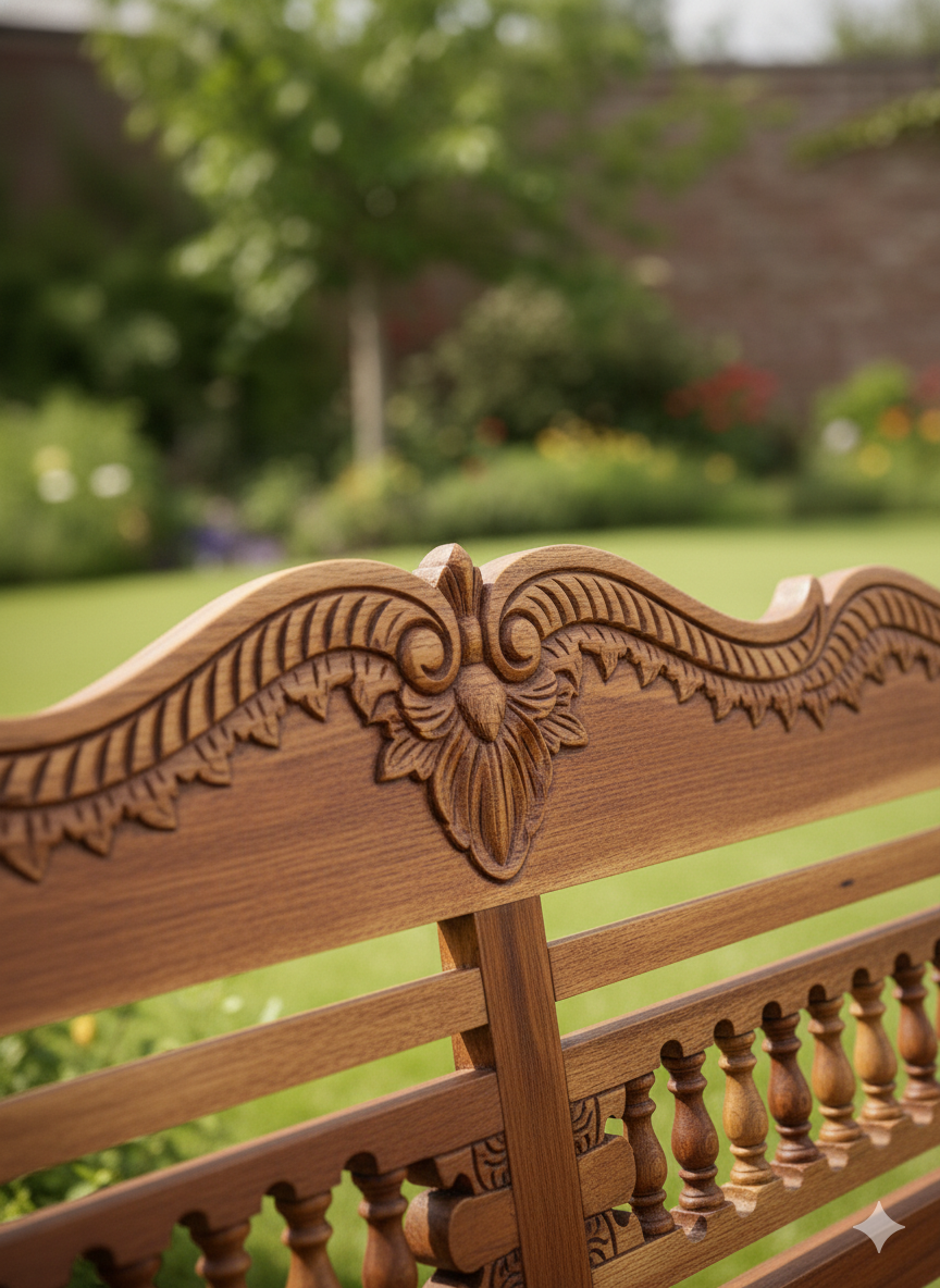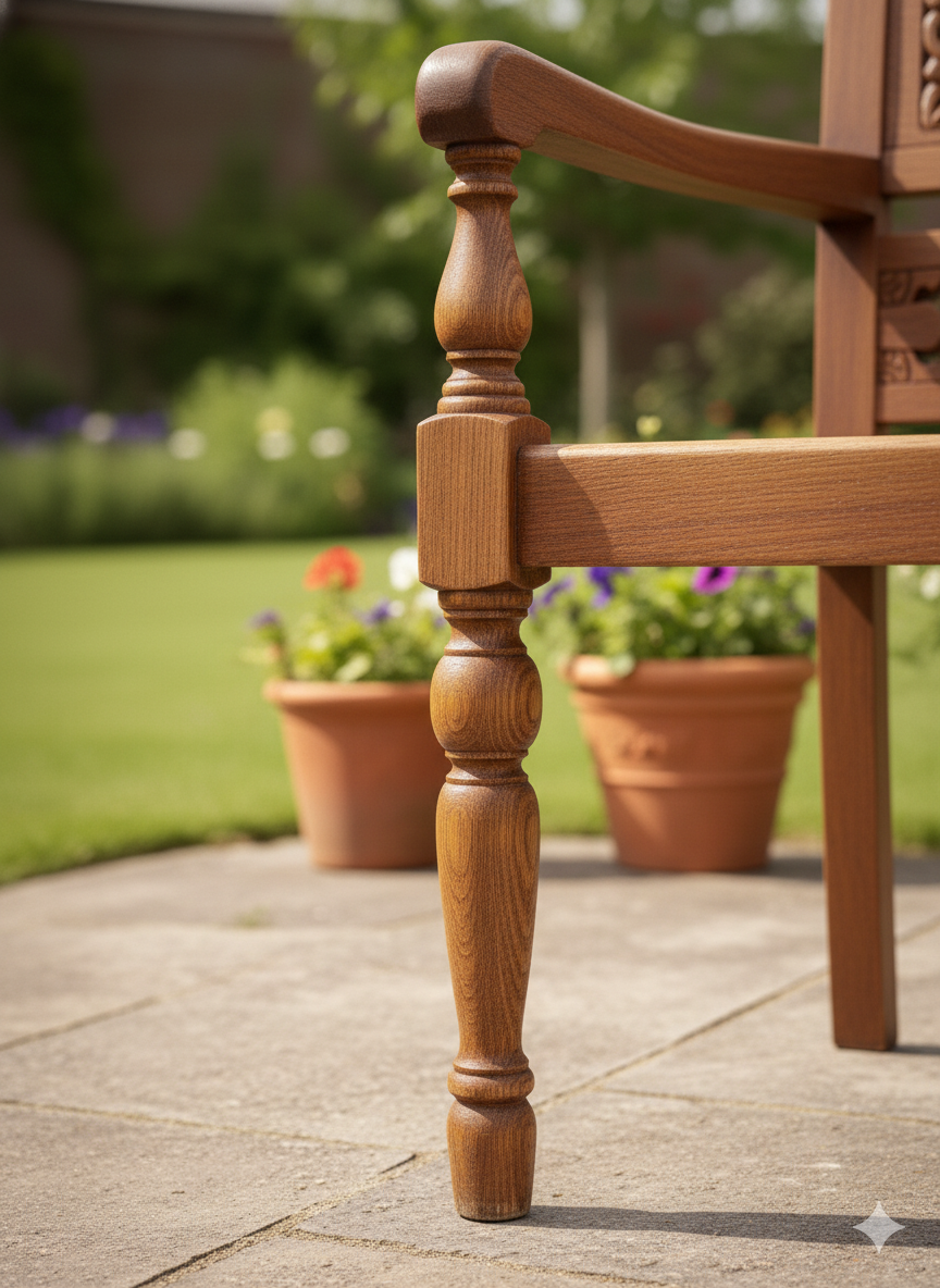 Su diseño artesanal en madera maciza de TEKA combina detalles tallados a mano con líneas clásicas, aportando encanto y elegancia a cualquier jardín, galería o patio.