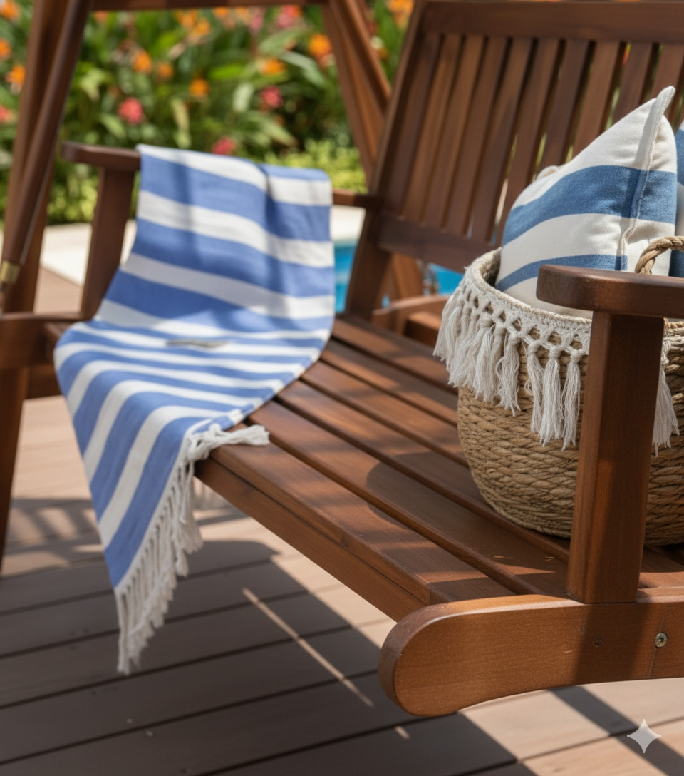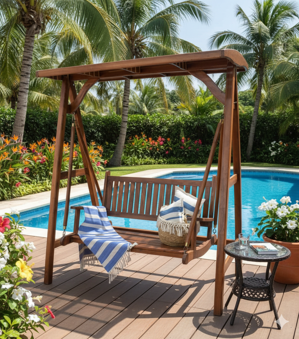 Perfecta para terrazas, galerías o jardines, ofrece un vaivén suave y confortable para desconectar, leer o simplemente disfrutar del paisaje. La madera de teka se destaca por su durabilidad natural, resistencia a la humedad y a los cambios climáticos, asegurando una larga vida útil sin perder su belleza.